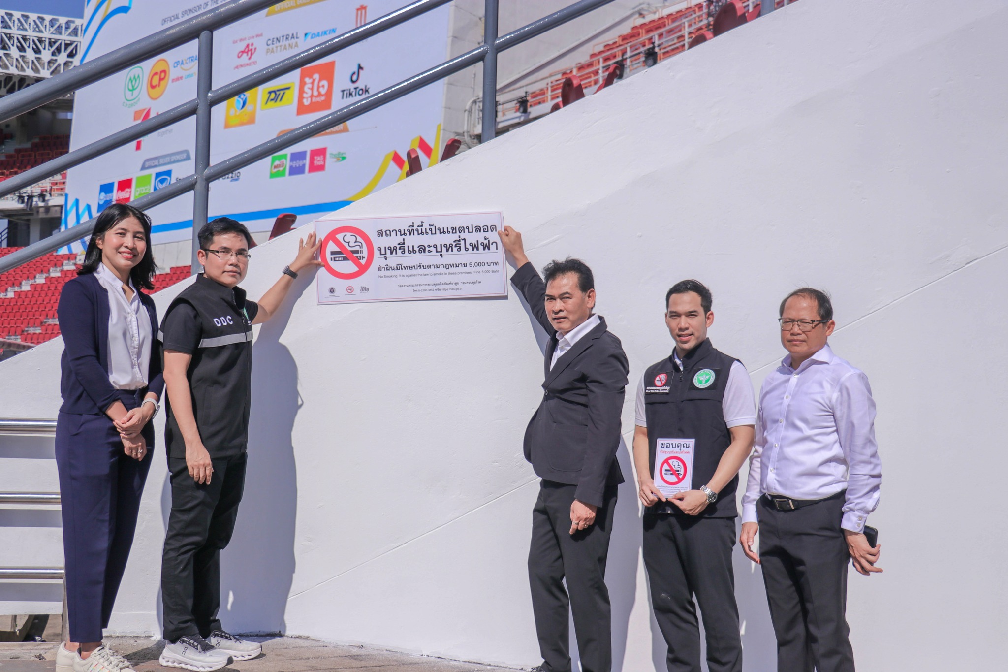 อนึ่ง การกีฬาแห่งประเทศไทย กองงานควบคุมผลิตภัณฑ์ยาสูบ กรมควบคุมโรค กระทรวงสาธารณสุข และมูลนิธิรณรงค์เพื่อการไม่สูบบุหรี่ ได้ลงพื้นที่ ติดตั้งป้ายสัญลักษณ์ “ห้ามสูบบุหรี่และบุหรี่ไฟฟ้า” ตามจุดต่าง ๆ ในสนามราชมังคลากีฬาสถาน ที่ผู้เข้าชมจะเห็นได้ชัด เพื่อให้สนามราชมังคลากีฬาสถานปลอดบุหรี่จริง ๆ ต่อไป